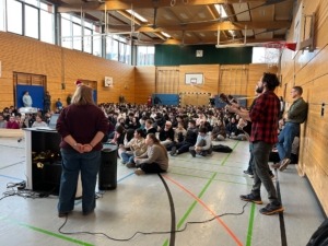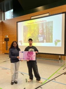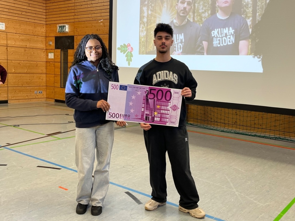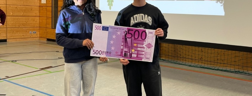 Besonders gefreut haben wir uns, dass wir die Ergebnisse des diesjährigen Sponsorenlaufs verkünden konnten: über 1500 EUR haben die Schülerinnen und Schüler der Brentano-Mittelschule im September an Spenden „erlaufen“! Ein Teil dieses Betrags, immerhin 500 EUR, gingen an die Organisation „Klimahelden Aschaffenburg“, die sich seit vielen Jahren für Klimaschutzmaßnahmen im Raum Aschaffenburg einsetzt. Leider konnten die Vertreter von „Klimahelden“ die Spende krankheitsbedingt nicht persönlich entgegennehmen, sie schickten uns aber eine Videobotschaft mit Grüßen und Informationen über die Arbeit des Vereins. Unsere beiden Schülersprecher Klivia und Baran überreichten deshalb symbolisch einen 500 Euro-Schein vor der Video-Leinwand.